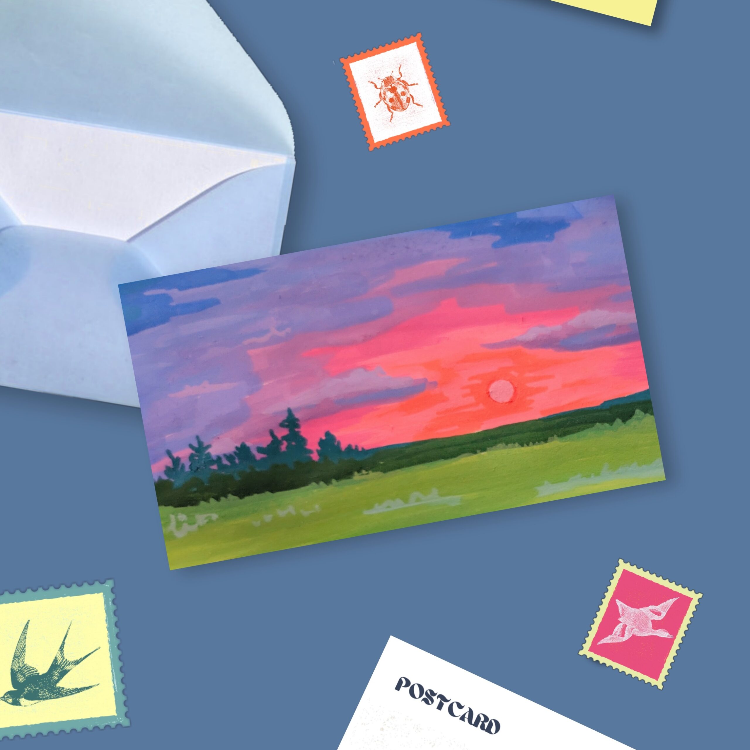 - Postcard featuring original art on the back (including postage)Â ready to brighten someone’s day