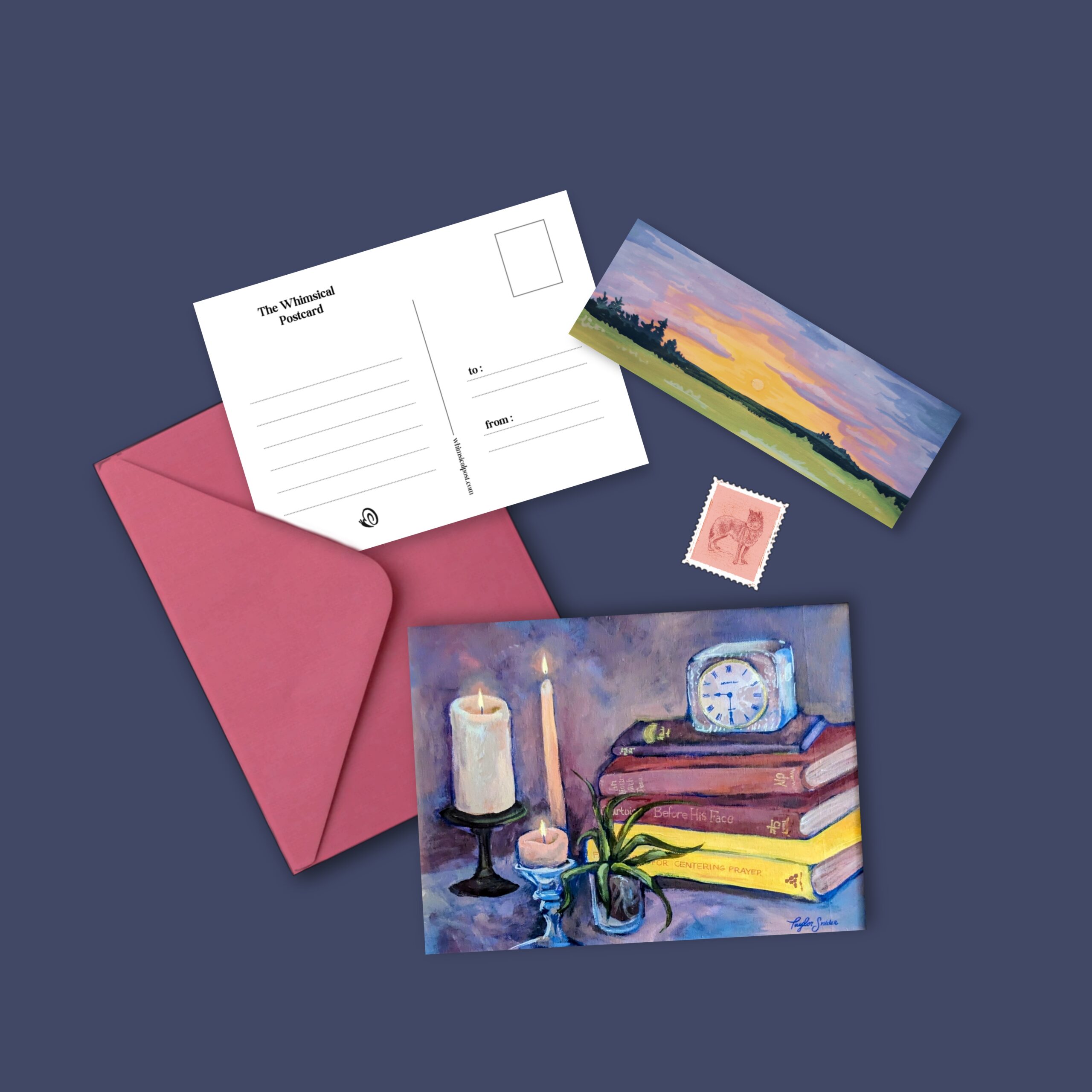 - Postcard featuring original art on the back (including postage)Â ready to brighten someone’s day